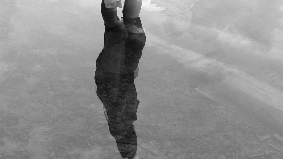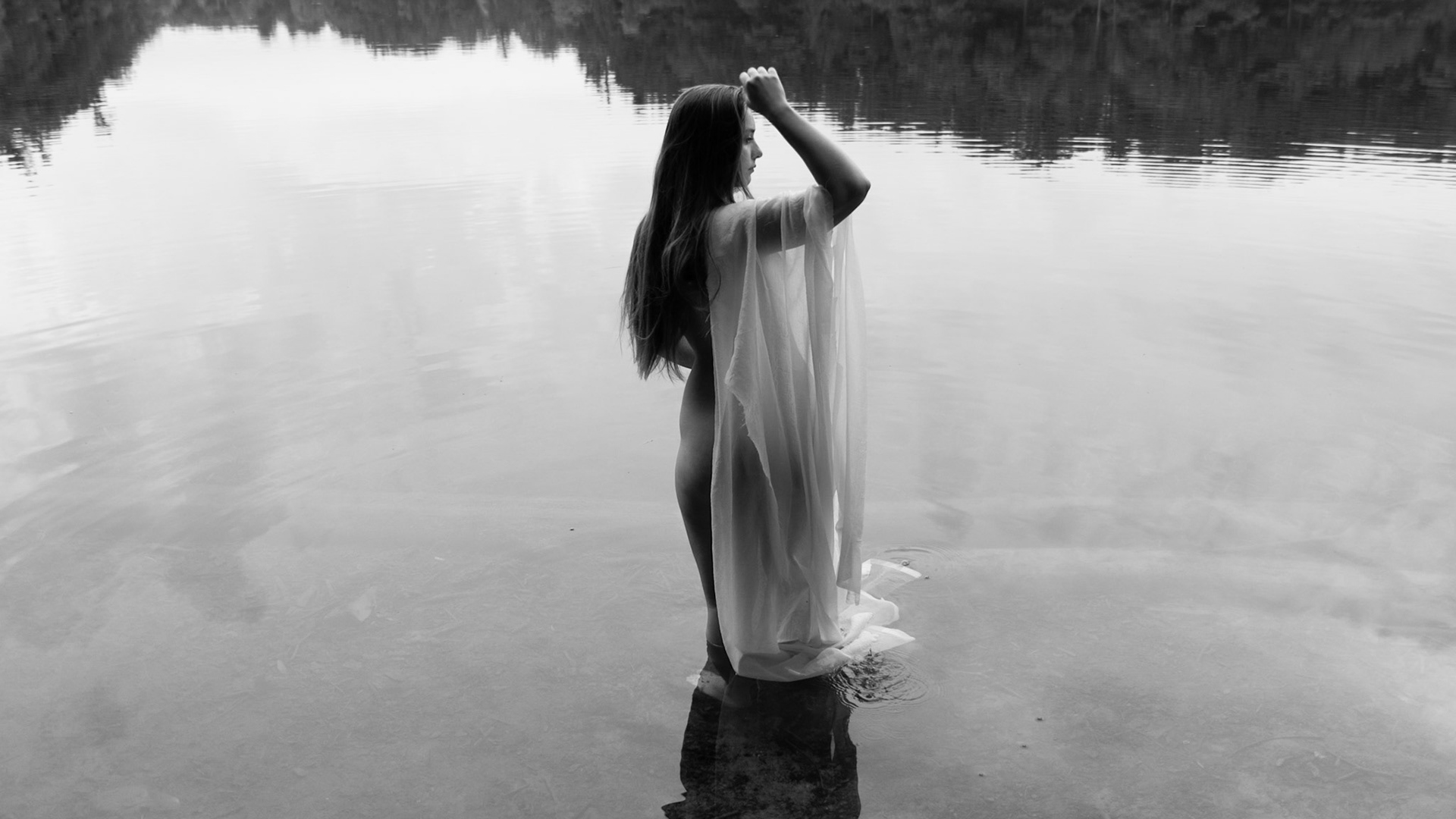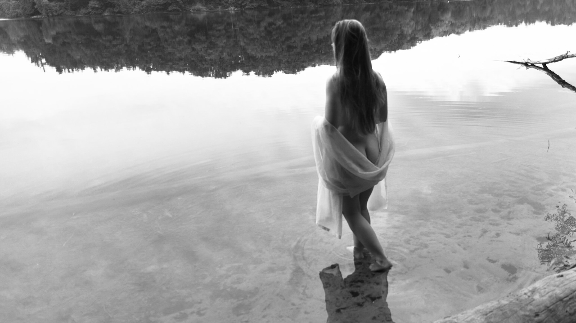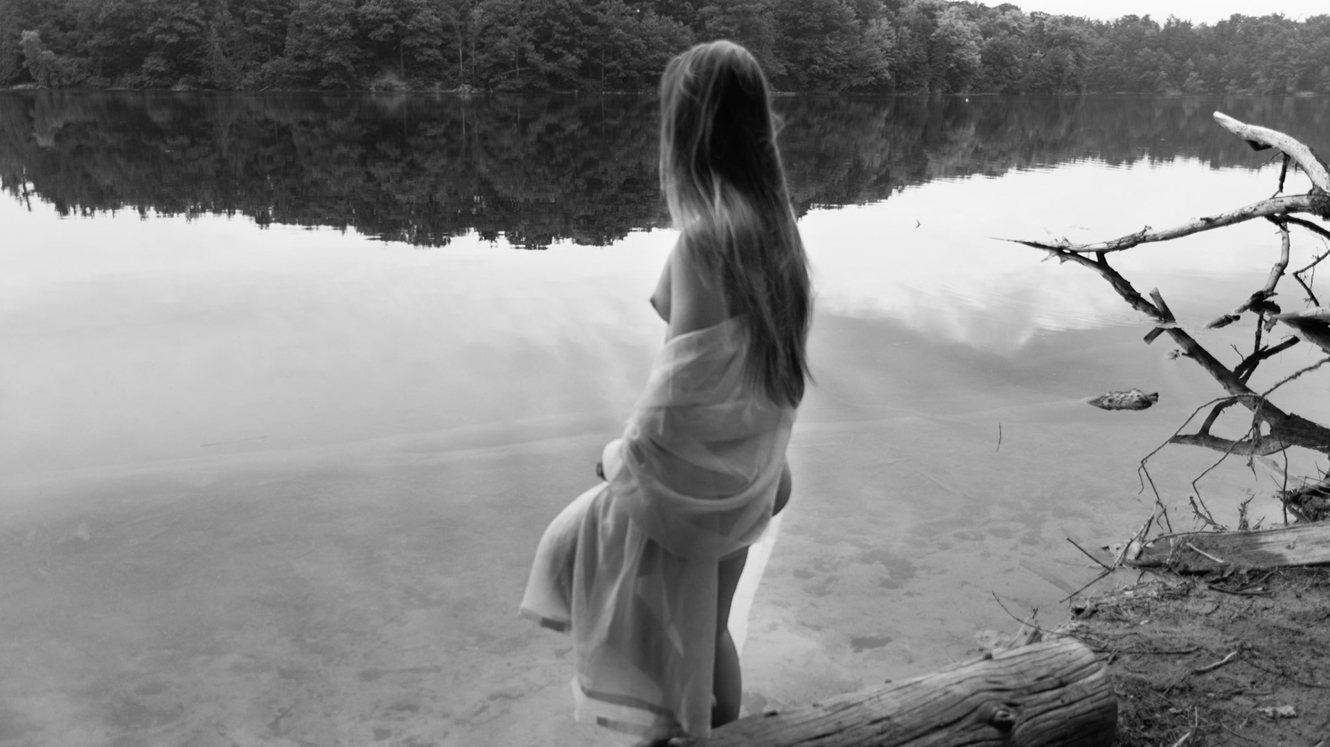 A woman entranced by a calm lake.