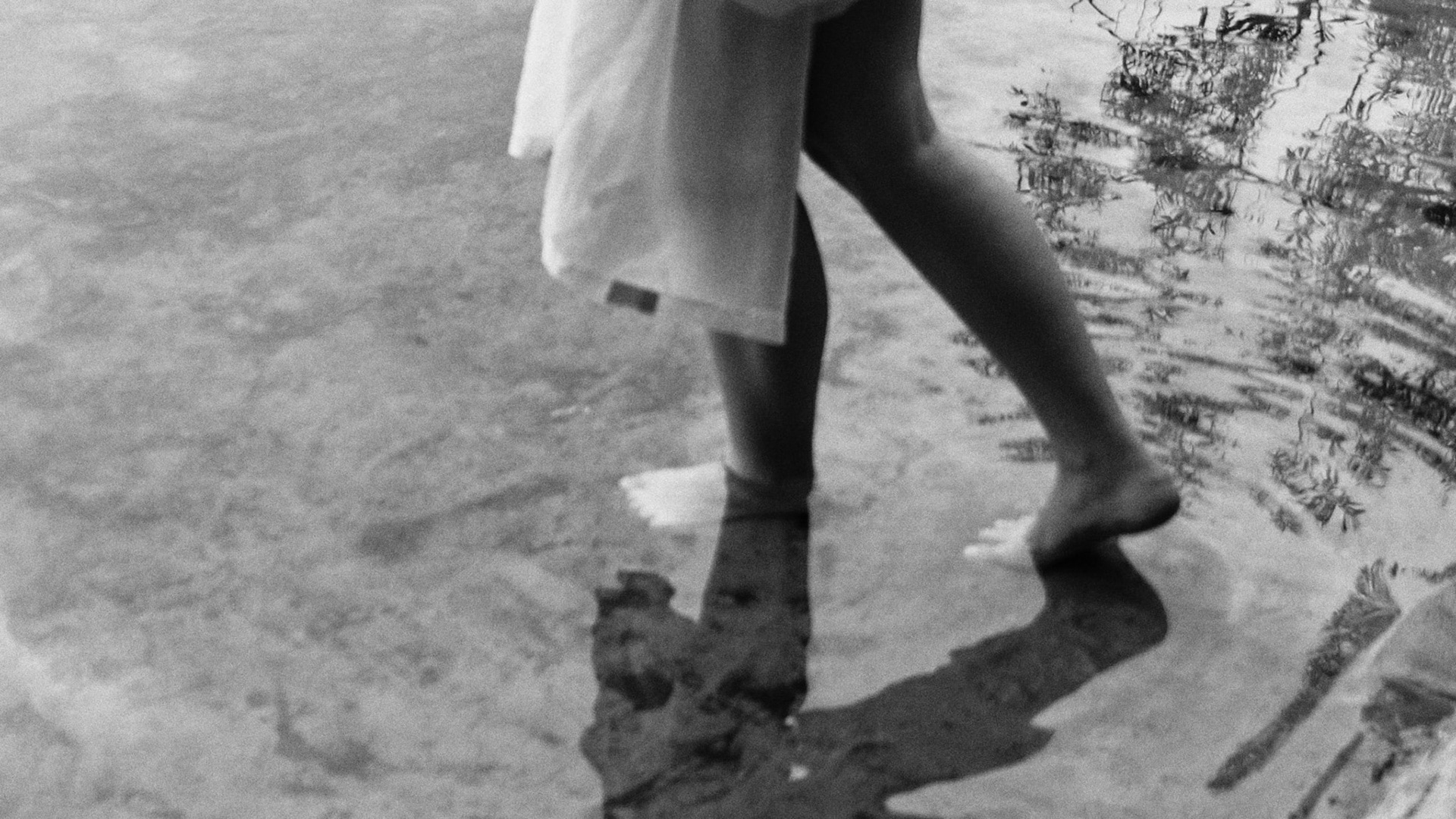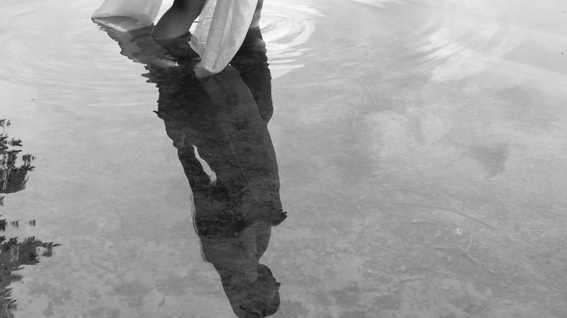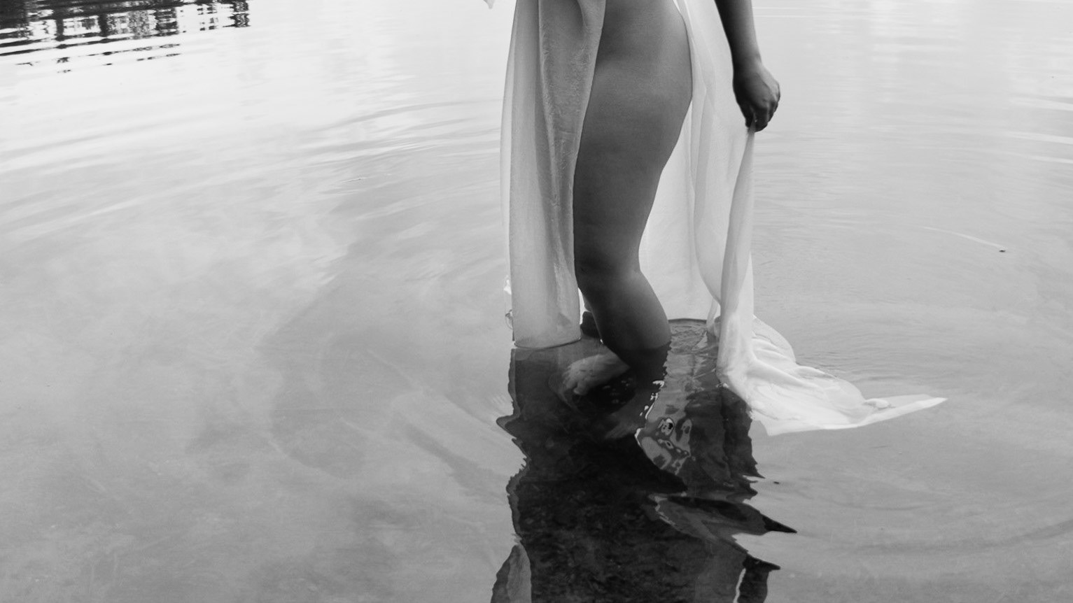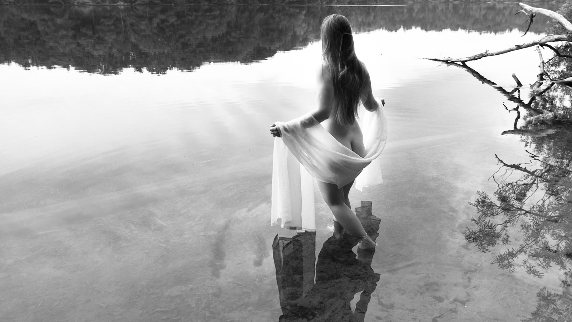 A woman entranced by a calm lake.