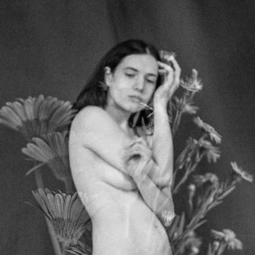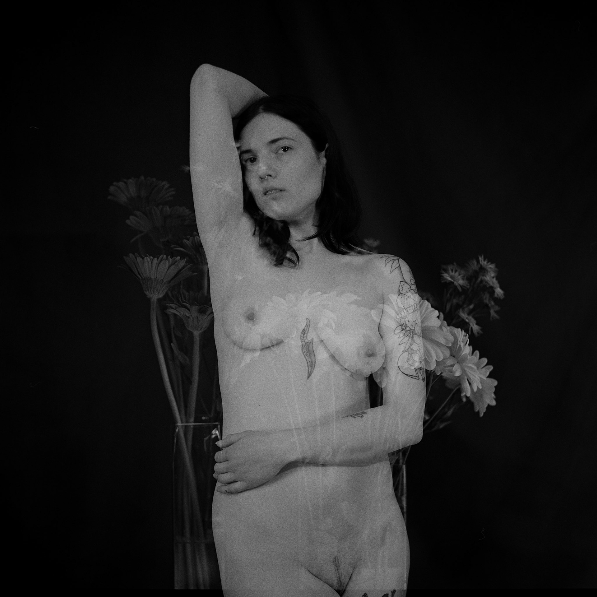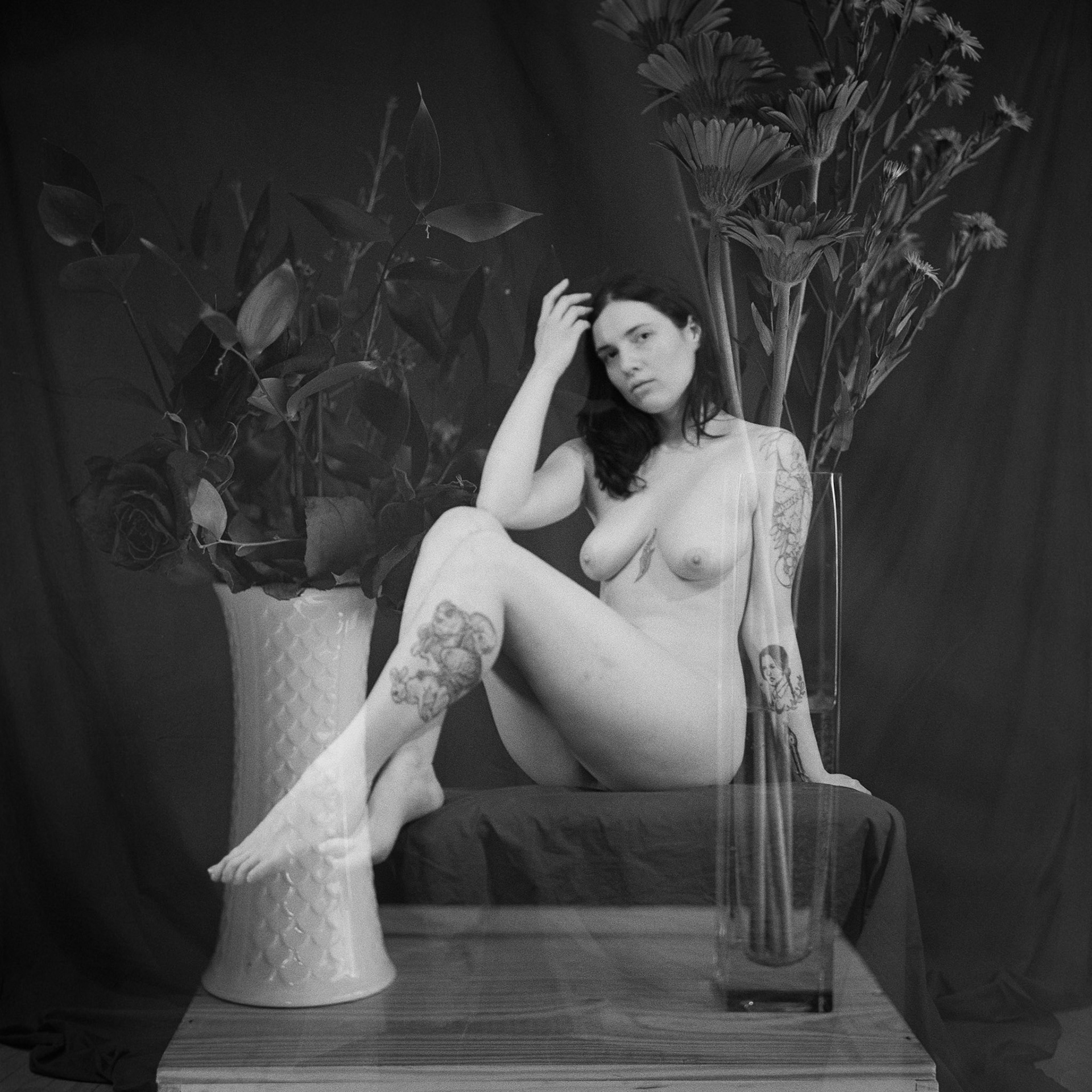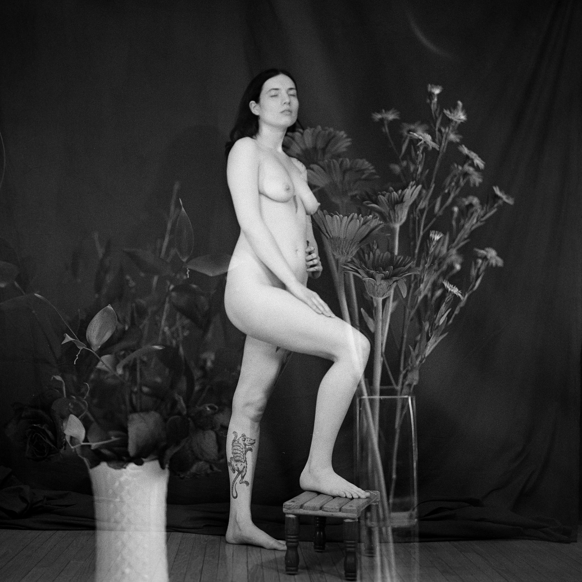 Another in my ongoing double exposure project. I work with a model in my studio (this time with KoriVee) then rewind the film and shoot it again in a nearby ravine or the down at the beach or, as in this case, with a bouquet of flowers.